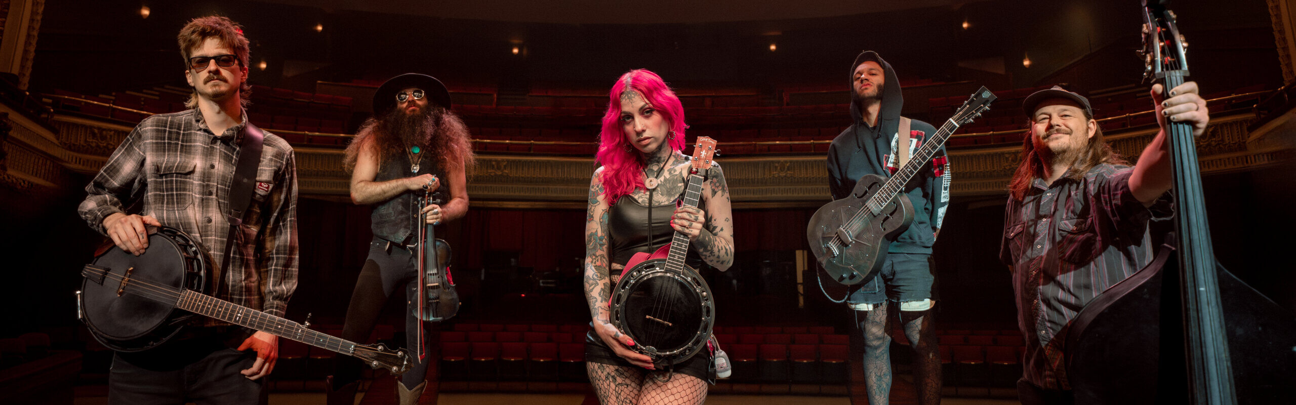 From the misty, pine-covered hills of the Pacific Northwest hail the Bridge City Sinners, who span the continuum from prohibition era jazz to Appalachian death folk. This traditional string band line up bends the meaning of the word genre, Playing festivals from Punk Rock Bowling, to Muddy Roots, to Oregon’s Bluegrass String Summit. They started their journey by busking on sidewalks across the country and now this supergroup of musicians find themselves on the national tour circuit. The Sinners still hold true to the DIY mentality of putting albums out on a self made record label, Flail Records. They recently hit #70 on the Billboard charts, top current album sales, for the week of September 4th 2021 for their album “Unholy Hymns”. With talented musicianship and a punk as f***! live show, this is one band you don’t want to miss.