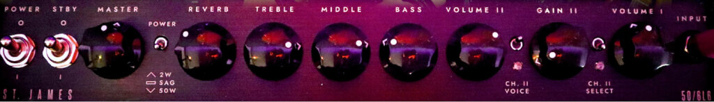 While John typically uses British voiced amps, we can get a similar mid range from the 6L6 tubes in the St James by running it on the drive channel with the drive set very low. The drive channel has a slight British push to the midrange.
