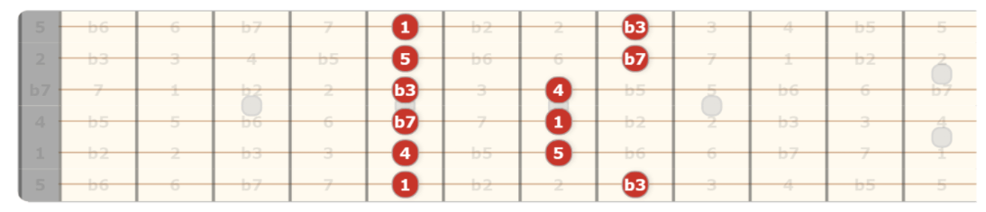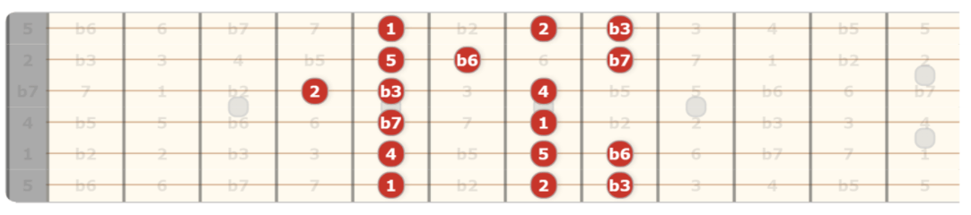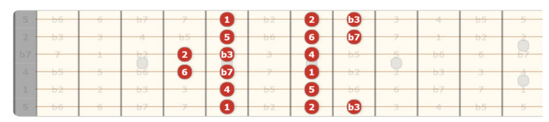 This mode is the opposite tonality to the major scale, this is minor in its purest form. To pair this with pentatonic, you take your existing pentatonic shape and add the 2 and b6 intervals.