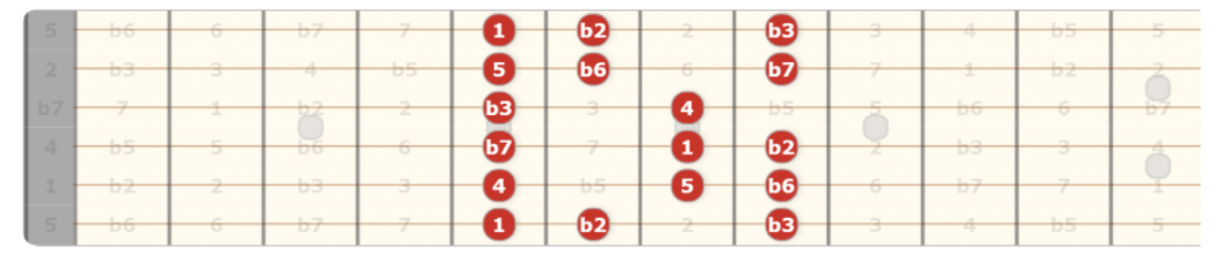 The Phrygian mode is commonly used in metal and rock, and it has a unique Eastern or Spanish flavour. This is provided by the b2 note. This shares the same notes as the Aeolian mode but the 2nd note is flattened by a semitone. This close movement from the 1 to the b2 is what gives this scale its identity.
