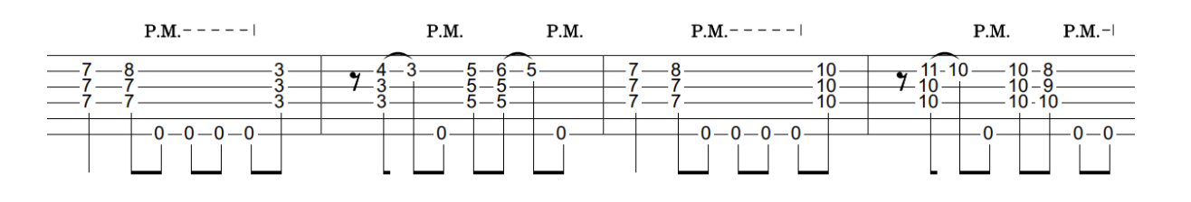 The first bar sees the chord placed on the 7th fret, which is then extended to the 8th fret on the B string by the third finger.