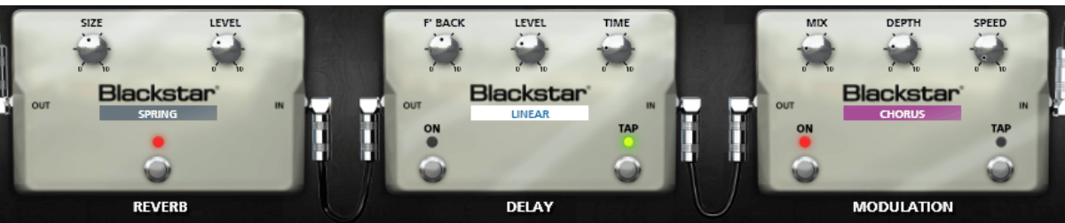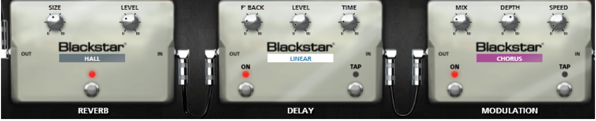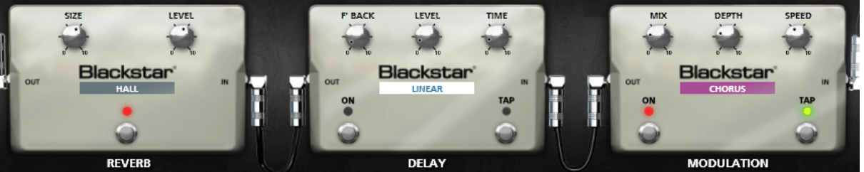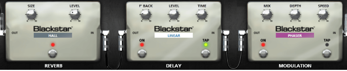 Sambora often had a little movement to his clean tones so a subtle phaser will help create that movement in the notes. It isn’t a forward sounding phaser, it just sits under what you play and creates some motion. This is also paired with a linear delay providing a quiet, tight repeat and a hall reverb.
